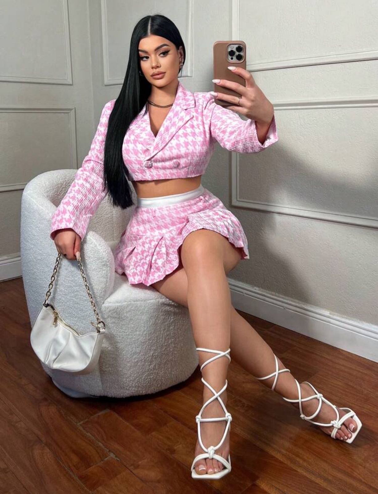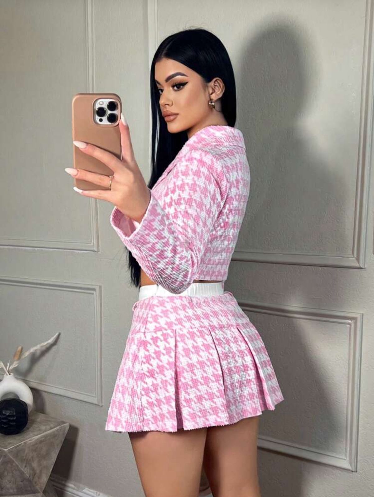 Set de dos piezas de blusa con estampado de pata de gallo de manga larga con botones y falda plisada
