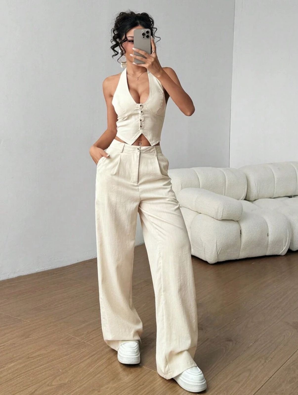 Set de dos piezas top con escote en pecho y espalda de botones y pantalon largo tipo cargo